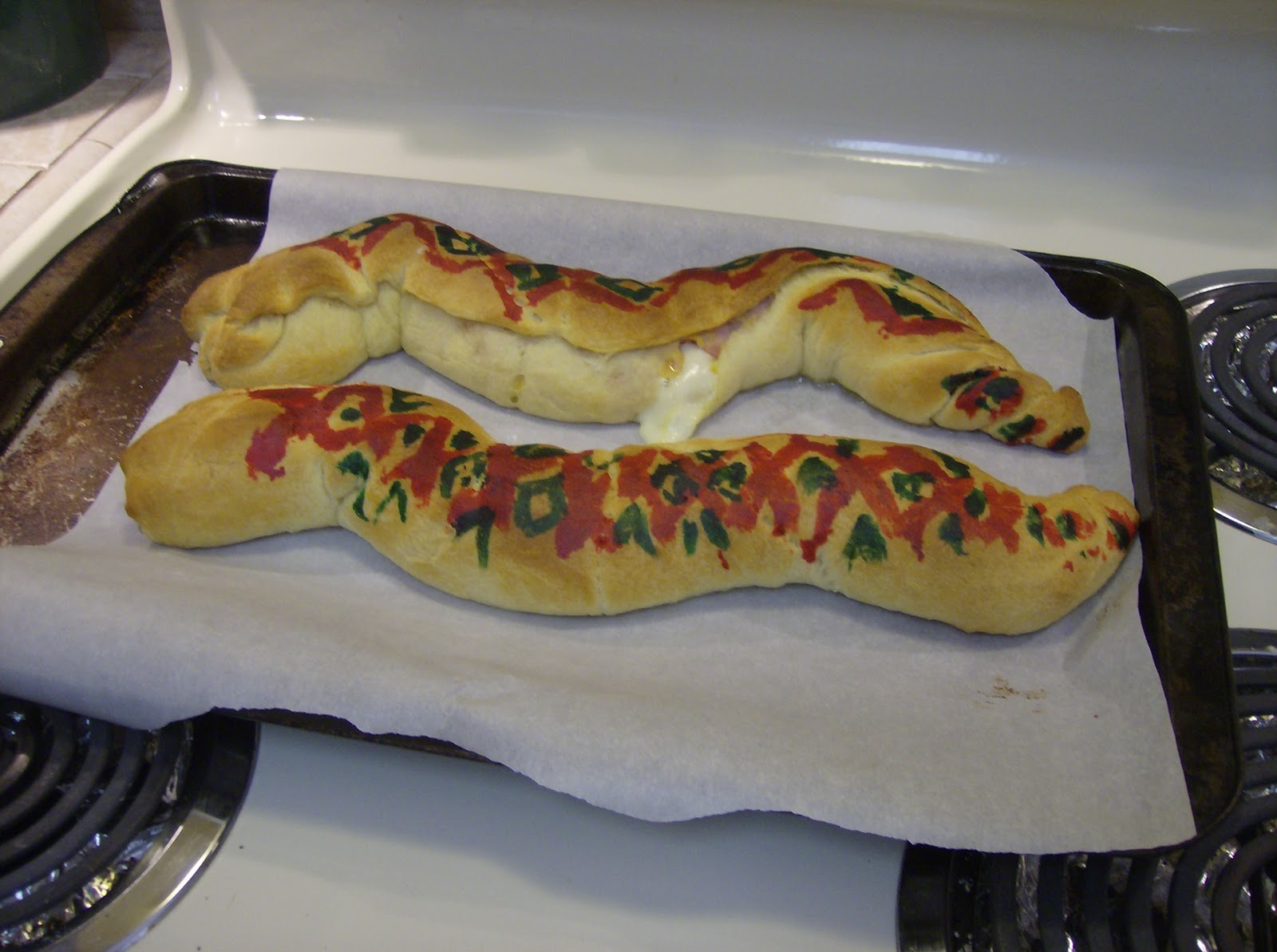Here are snake sandwiches. They are made of crescent rolls and stuffed with ham and Muenster cheese. She finishes them with faces. The pictures are down below of the faces.